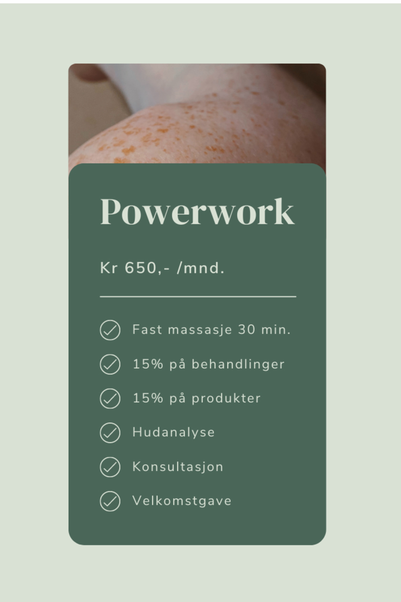 Alltid time til en Powerwork! Du får redusert pris på en fast avtalt massasje i måneden. Våre terapeuter bruker en rekke forskjellige grep, strekke-, tøye- og bløtvevsteknikker for å redusere muskelknuter, anspenthet, stress og tretthet i muskulaturen samt stimulere blodsirkulasjonen. Våre faglig flinke spesialister sørger for at du får profesjonell behandling hver gang.