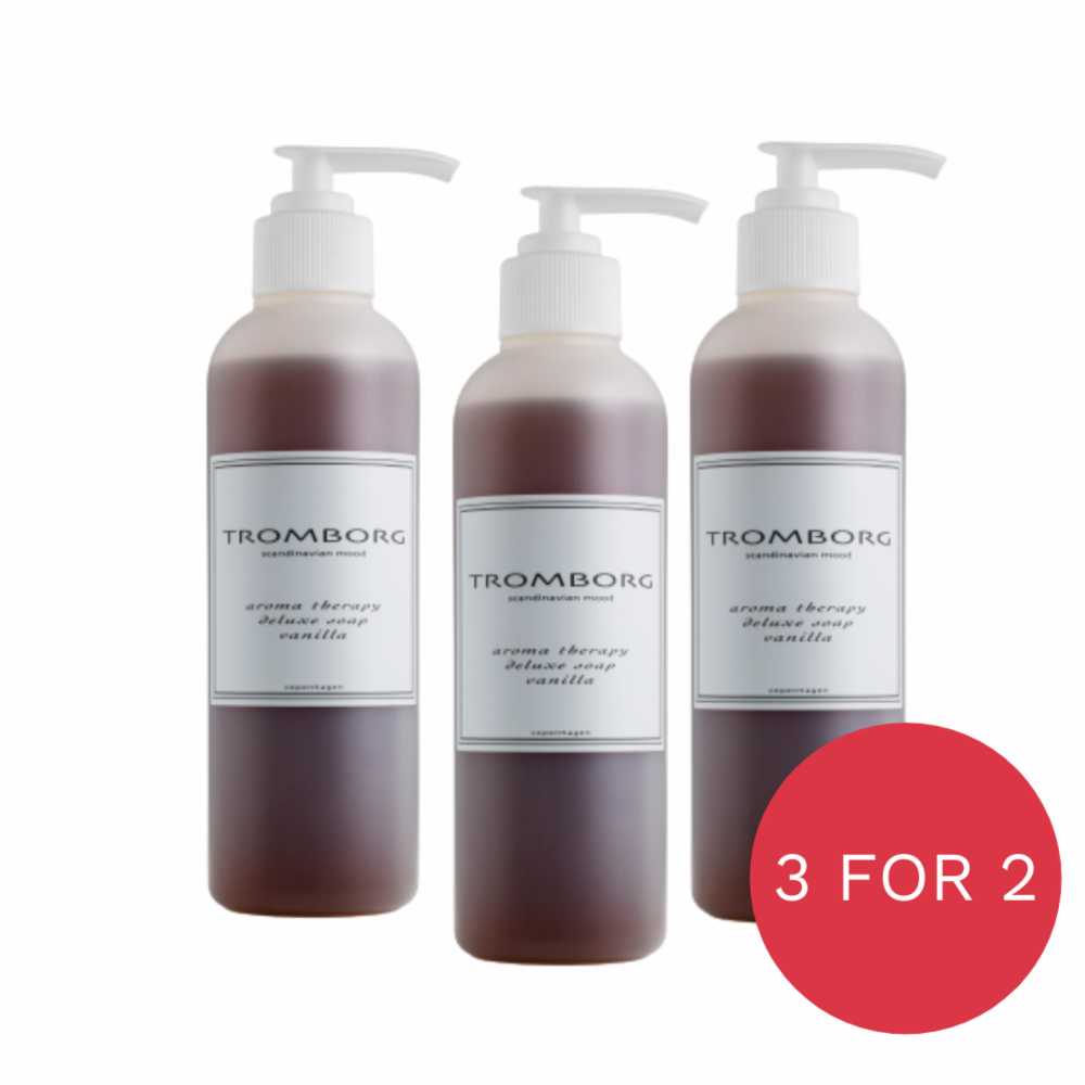 Tromborg 3 x Handsoap Vanilla inneholder tre økologiske såper. Alle Tromborg sine håndsåper kommer med en pumpedispenser og er enkle, hygieniske og gleder sansene. De mykgjør, gir fuktighet til hendene og gir et snev av luksus sammen med fordelene av aromaterapi. Hendene dine føles fantastisk myke. Vanilje er sanselig og harmoniserende, duften hjelper med å bekjempe stress, sinne eller frustrasjon og fremmer en følelse av indre ro og velvære. Tromborg håndsåpe får du i Vanilla, Lavendel, Ginger og Deluxe. For optimal pleie, bruk Deluxe håndkrem etter vask.